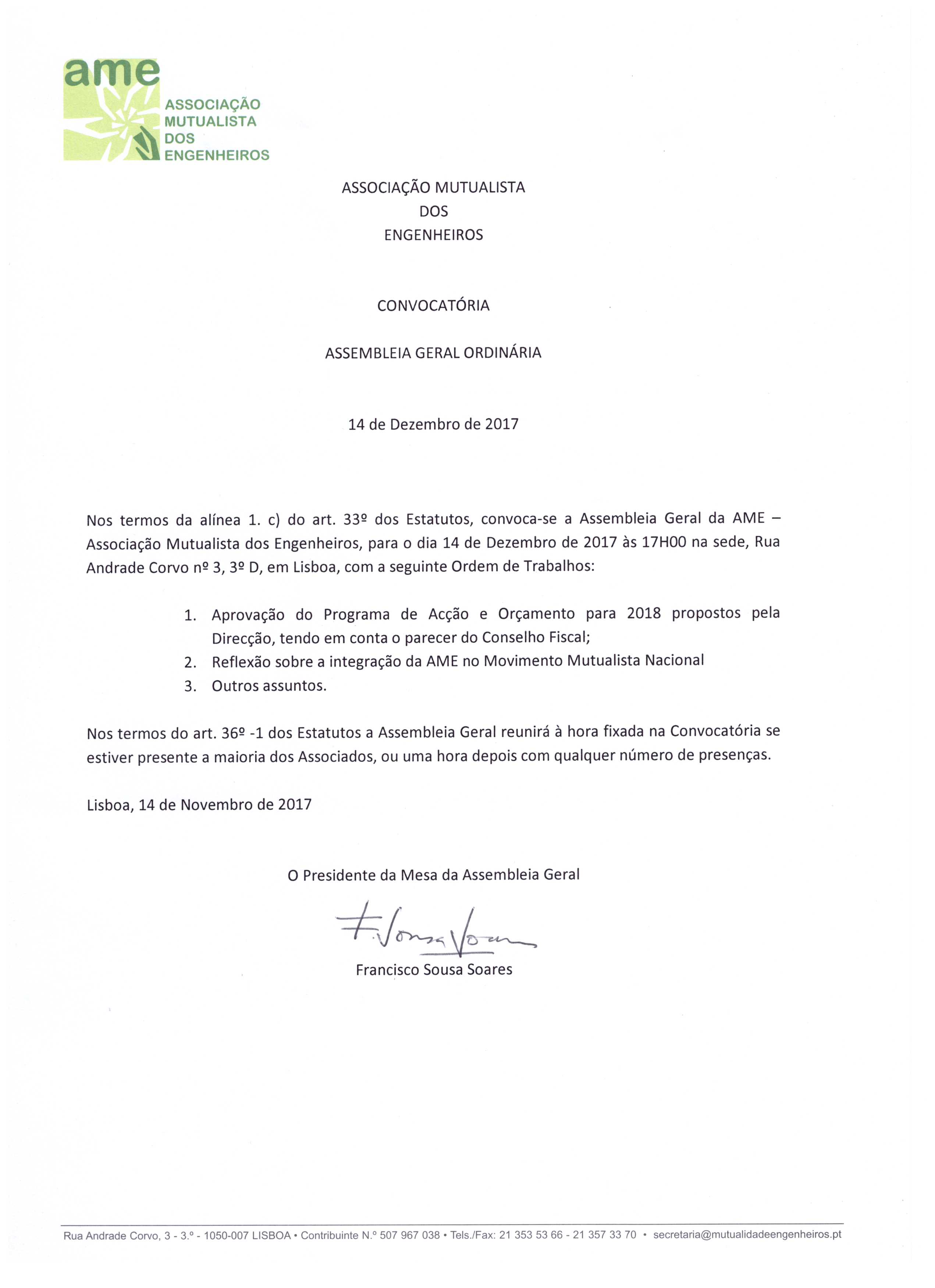 Assembleia Geral Ordinária da AME - 14 Dezembro 2017